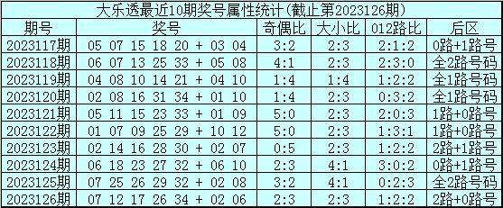 大乐透第2023126期开奖号码:07 12 17 26 34 + 02 06。前区奖号大小比为2:3,奇偶比为2:3,012路比为1:2:2,后区为2路+0路号。