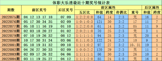 上期开奖:体彩大乐透第2022084期开奖号码为:03、11、19、25、27+04、12。前区五区比为1:1:1:2:0,和值为85,首尾间距为24,奇偶比为5:0,无重号。后区号码和值为16,跨度为8。