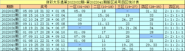 许老六大乐透第2022042期前区四区划分分析(定义:01-09段为一区,10-18段为二区,19-27段为三区,28-35段为四区):