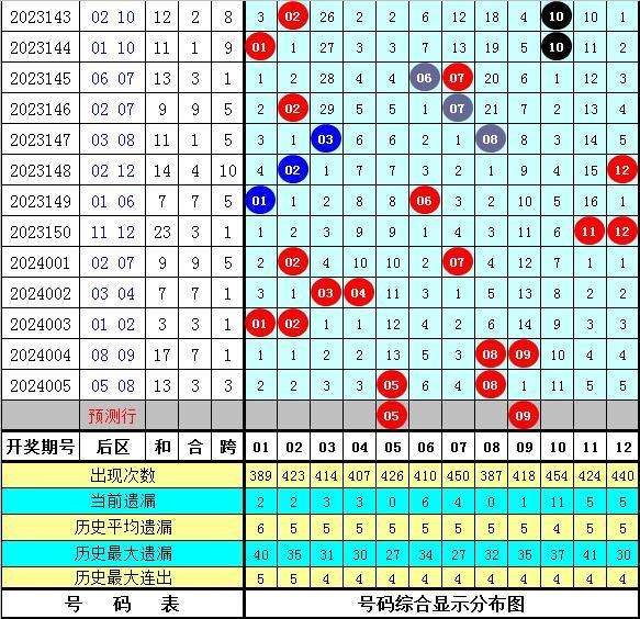 9。在历史同期奖号中,后区号码05出现7次;06 07 12出现4次;03 08 09出现3次;02 04出现2次;01 11出现1次;10历史同期没有出现。