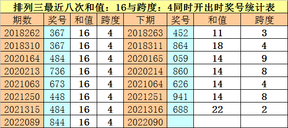 体彩排列三最近八次同时出现和值:16与跨度:4的奖号分别为:367、367、484、736、673、448、484、844,前七次下期开出奖号分别为:452、864、059、860、626、941、688,详见下表: