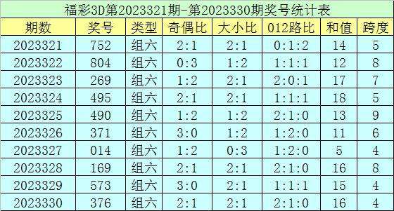 上期回顾:福彩3D第2023330期开奖号码为376,组选类型为组六,奇偶比为2:1,大小比为2:1。