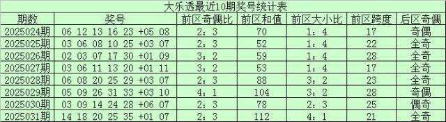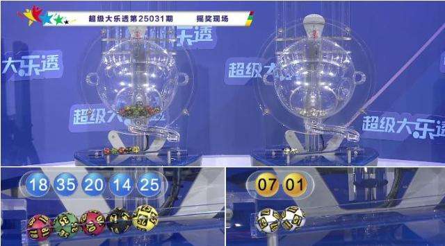 大乐透第25031期奖号为:14、18、20、25、35+01、07。其中前区和值为112,奇偶比为2:3,大小比为4:1。后区为一大一小、全奇组合。
