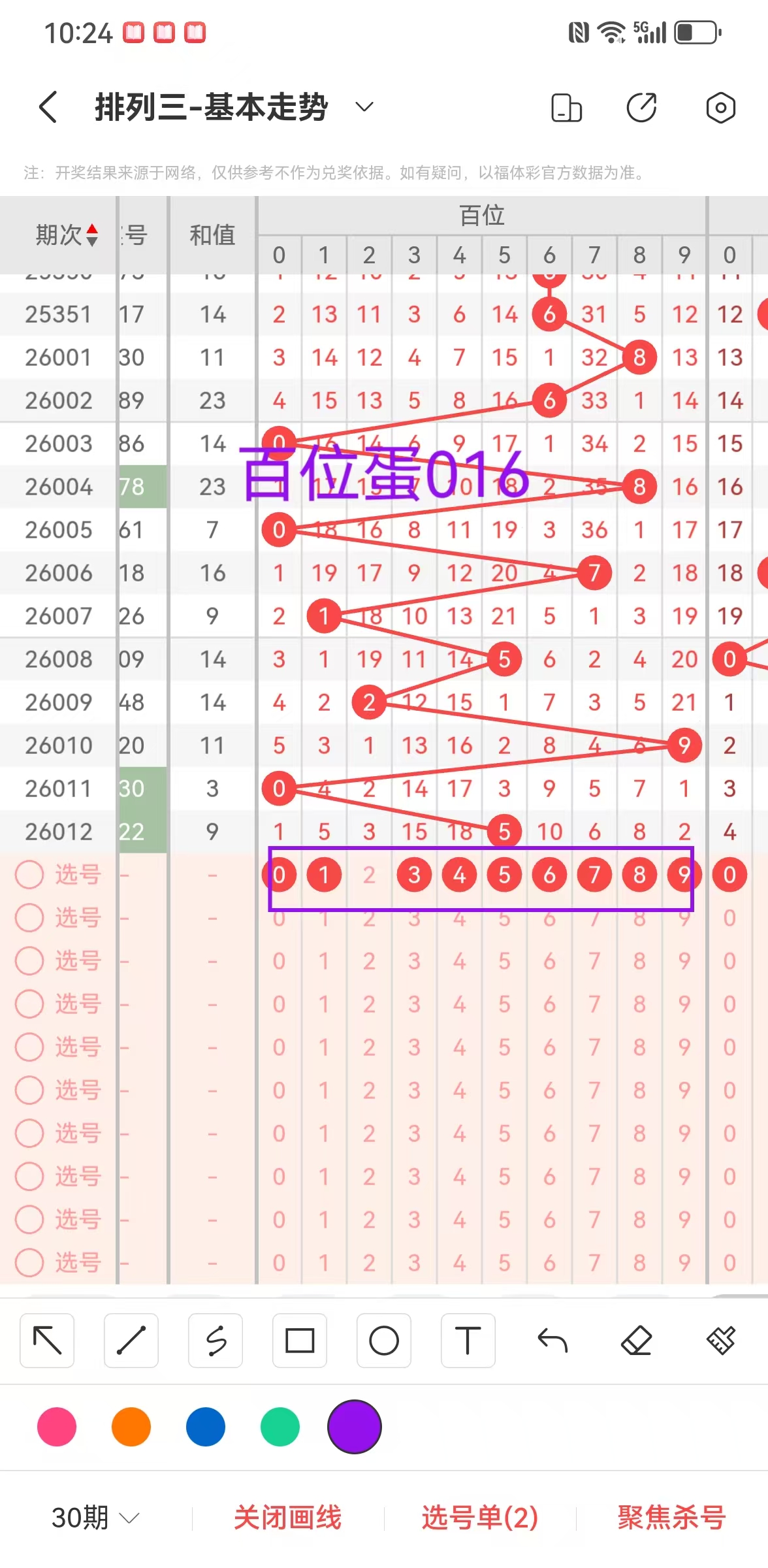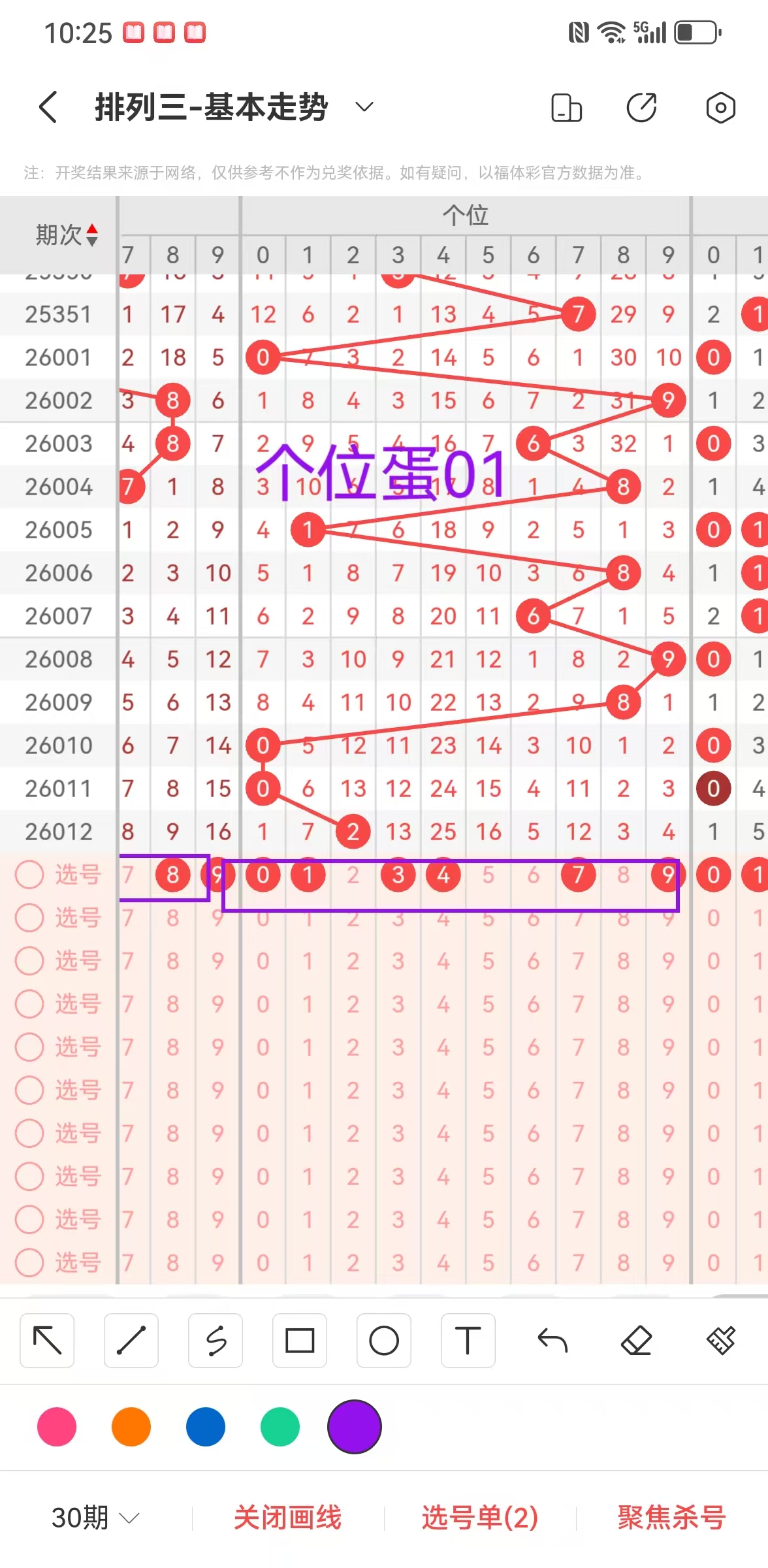 ③十位012路比:近5期012路比为:2:1:2,0路号码依次开出 03,0路中大小0:2,奇偶比为1:1, 1路号码依次开4,1路中大小0:1,奇偶比为0:1,2路号码依次开出22,2路中大小比0:2,奇偶比为0:2,通过对比分析得出(1379)