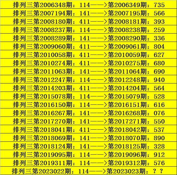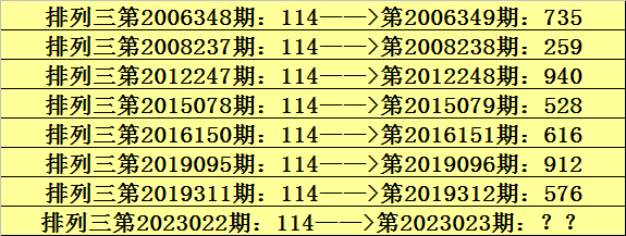 第2023022期排列三奖号为114,历史上该号码直选出现8次,下期奖号分别为:735、259、940、528、616、912、576。