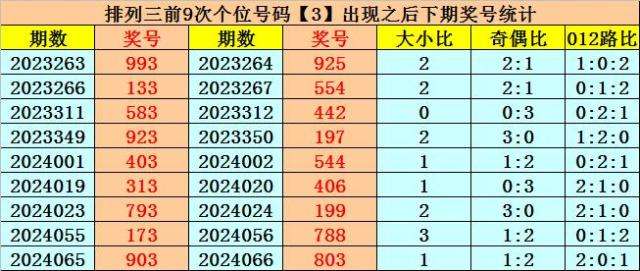 个位前9次开出号码3时,该位下期奖号分别为:5-4-2-7-4-6-9-8-3,其中号码个数大小比是5:4,012路比是3:3:3,奇偶比是4:5。