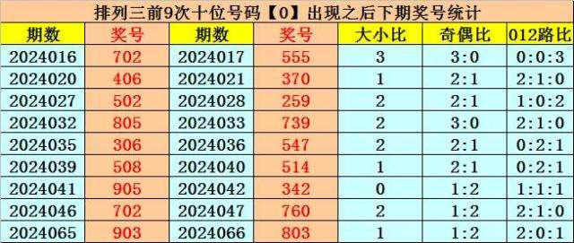 在十位前9次出现号码0后,其下期奖号分别开出:5-7-5-3-4-1-4-6-0,其中奖号个数奇偶比是5:4,大小比是4:5,012路比是3:4:2。