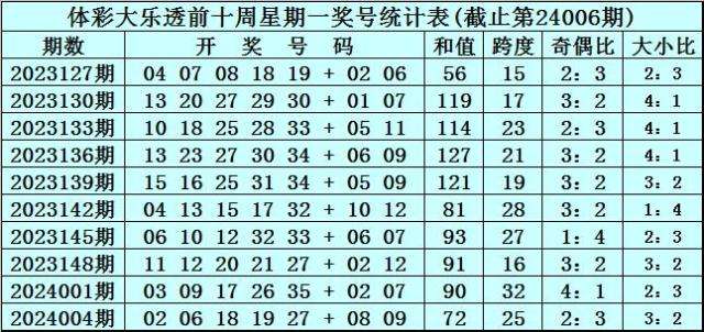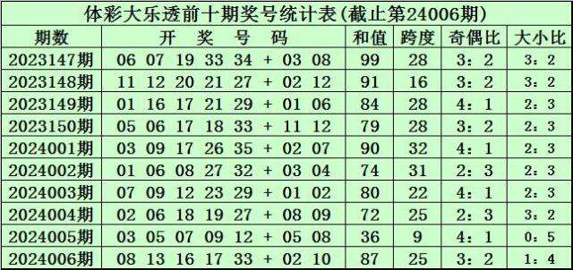 体彩大乐透第24006期奖号为:08 13 16 17 33 + 02 10。前区奖号和值为87,跨度为25,奇偶比为3:2,大小比为1:4。后区奖号和值为12,跨度为8。