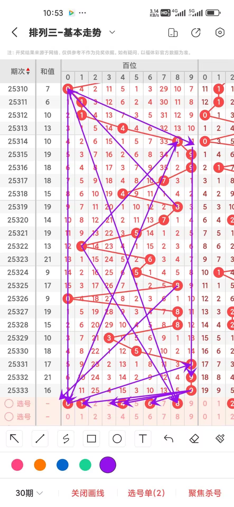 2025333期上期百位开出奇数9,我们通过走势图来看百位上500期,0-9下号数据和最大遗漏数据,其中0出现43次,1出现63次,2出现49次,3出现47次,4出现45次,5出现49次,6出现48次,7出现50次,8出现56次,9出现50次,0-9目前18下号最多,我们在回过头来看最大遗漏下号,0遗漏55次,1遗漏45次,2遗漏31次,3遗漏38次,4遗漏31次,5遗漏52次,6遗漏25次,7遗漏35次,8遗漏33次,9遗漏41次,目前遗漏中05遗漏最大,通过上面的走势分析我们可以看出目前百位上走势比较好的号码是0路,热号是9路号码我们可以关注下,1247号码走势就有点冷淡,我们可以防守,今天百位我们重点关注134678,具体看下面走势图