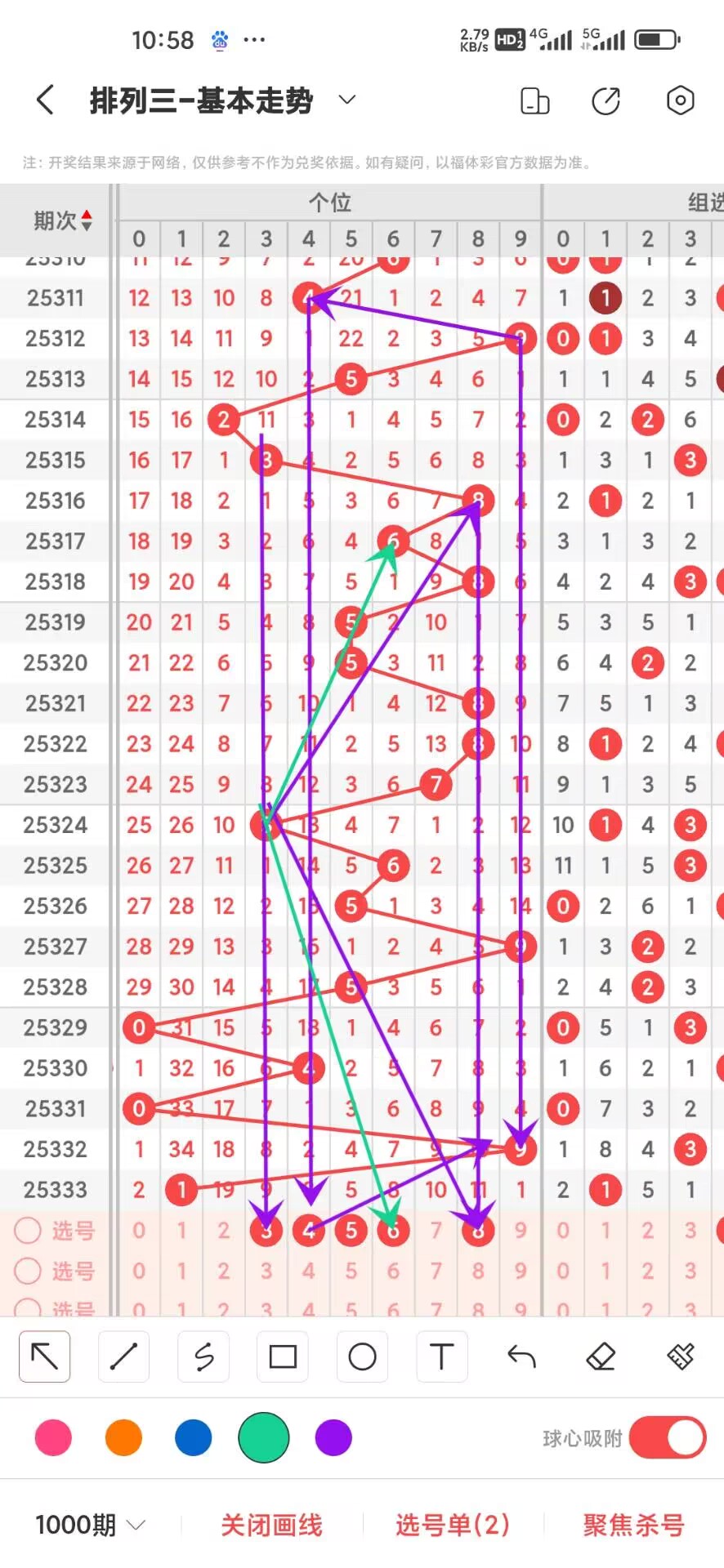 2025333期上期个位开出奇数1,我们通过走势图来看个位上500期,0-9下号数据和最大遗漏数据,其中0出现43次,1出现51次,2出现46次,3出现61次,4出现57次,5出现50次,6出现48次,7出现53次,8出现57次,9出现34次,0-9目前13478下号最多,我们在回过头来看最大遗漏下号,0遗漏45次,1遗漏45次,2遗漏46次,3遗漏36次,4遗漏29次,5遗漏53次,6遗漏44次,7遗漏31次,8遗漏40次,9遗漏54次,目前遗漏中347遗漏最小,通过上面的走势分析我们可以看出目前个位上走势比较好的号码是568,热号是2路号码我们可以关注下,278号码走势就有点冷淡,我们可以防守,今天个位我们重点关注34578,具体看下面走势图