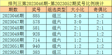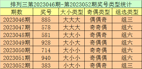 排列三第2023052期回顾:奖号383,奇偶比2:1,大小比1:2,和值14,类型:组三。