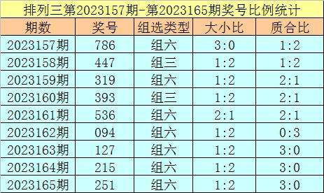 上期回顾:排列三第2023165奖号开出251,奖号质合比为3:0,大小比为1:2,跨度为4,类型为组六。