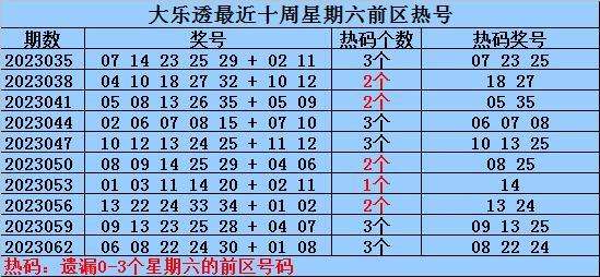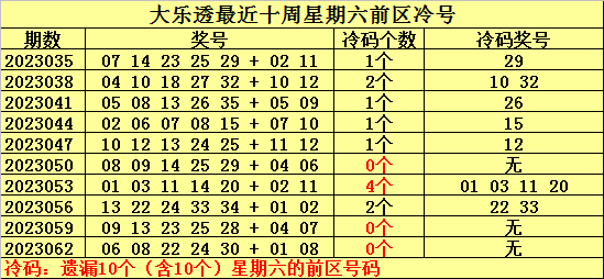 冷号:最近十周星期六前区开出12个冷号,上周星期六冷号轮空,本周星期六放弃冷号出现的可能。
