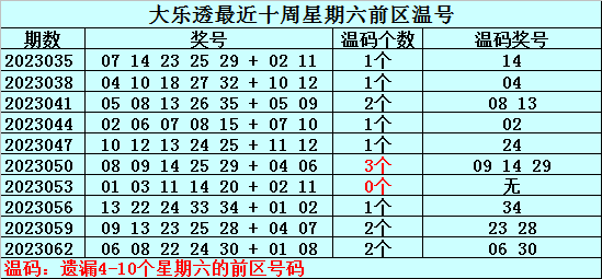 温号:最近十周星期六前区开出14个温号,上周星期六前区开出2个温号,本周星期六排除温号。