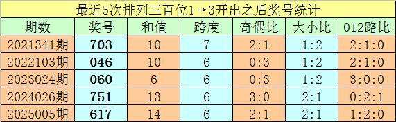 1、排列三最近两期百位号码分别开出1和3,历史上百位号码连续两期分别开出1和3的奖号出现了66期。前五期开出之后其下期奖号分别为:703、046、060、751、617;