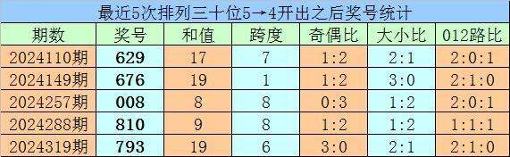 1、最近两期排列三十位号码开出号码分别为5和4,历史上十位号码连续两期同时出现号码5和4的奖号共开出71期。最近五次下期开出号码为:629、676、008、810、793;