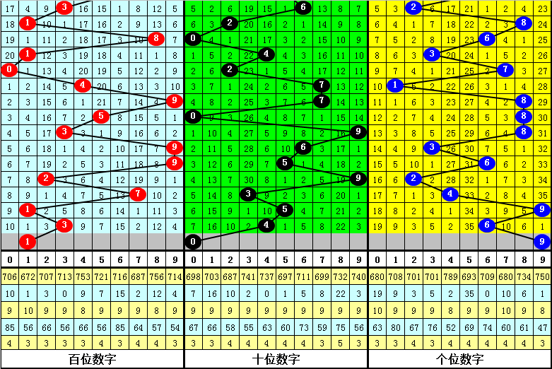3、在以上0-9号码频次中,号码012路比为25:24:16,奇偶比为28:37,本期预计百位开出奇数号码,参考号码1。