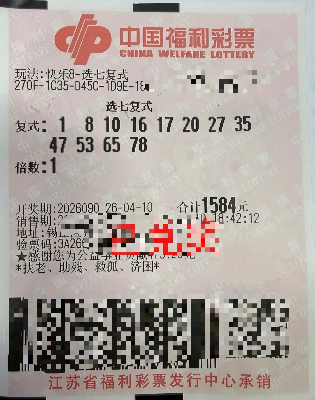 无锡彩民喜获"快乐8"11.28万元奖金