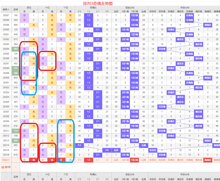 上一期的奇偶比为2:1,俩奇的号码组合,从近五期的奇偶数出现情况看,奇数出8次,偶数出现7次,奇数号码出现较平均,本期要侧重两偶的号码组合,侧重偶偶奇或偶奇奇的号码组合,根据奇偶组合形态可做五码定位02468/02468/13579或02468/13579/13579