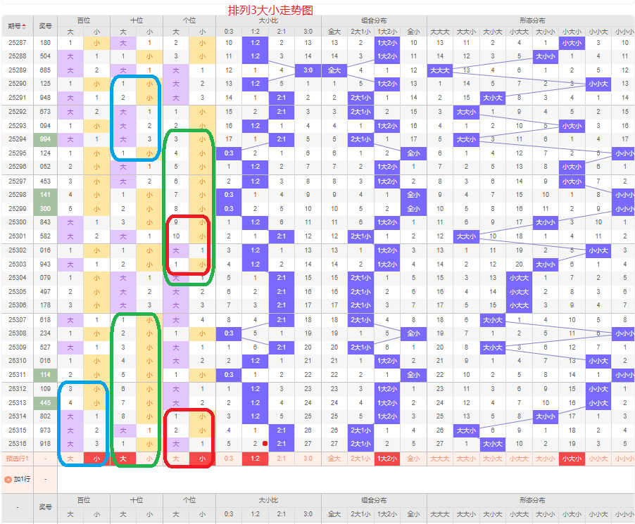 上一期012路个数比为1:1:1,是全路的号码组合,上期没有断路的号码,本期的号码以两路的组六组合号码为主,本期0路的号码可能会出现,本期应该会有2路的号码,本期以02路的组六组合号码为主,防12路和01路的组合,侧重02路的号码组合。
