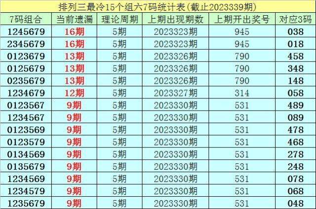 (3)在排列三第2023340期开奖中,预计1245679、2345679组合出现的可能性较小,注意另外三个号码中开出奖号,否则应关注组三或豹子组合。