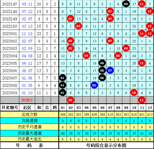 后区大小判断:最近30期后区奖号大小比为31:29,最近15期后区奖号大小比为17:13,最近7期后区奖号大小比为5:9,本期后区参考一大一小组合,两码关注02 11。