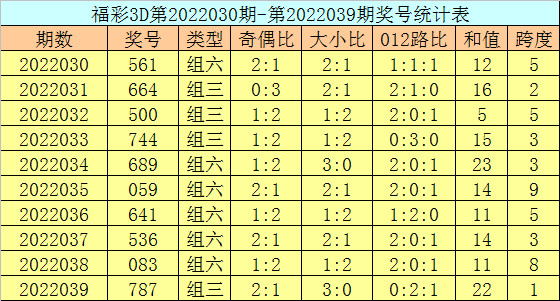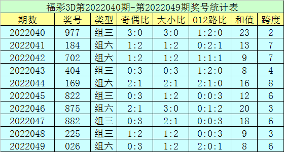 上期回顾:福彩3D第2022049期开奖号码为026,组选类型为组六,奇偶比为0:3,大小比为1:2。