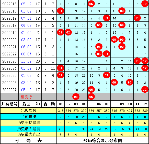 5、前区五区分析:最近9期前区五区比为13:6:10:7:9,上期第一、五区热出2个奖号;第三、四区断区。本期防第二、三区转冷,看好第一、五区开出2个奖号,关注五区比2:0:0:1:2。