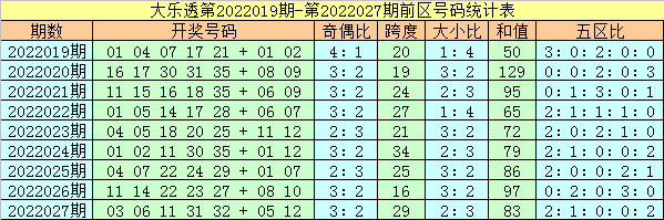 上期回顾:体彩大乐透第2022027期奖号:03 06 11 31 32 + 05 12,其中前区五区比为2:1:0:0:2,奇偶比为3:2,大小比为2:3,和值为83,后区号码大小比为1:1,奇偶比为1:1。
