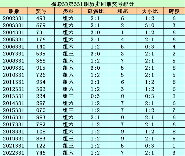 福彩3D历年第331期同期奖号为:493 679 731 176 140 535 368 915 726 934 382 224 287 070 983 782 108 883 122 746。