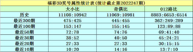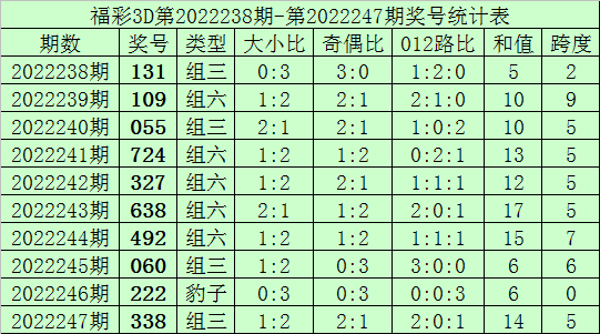 开奖回顾:福彩3D第2022247期奖号为338,其中奖号大小比为1:2,奇偶比为2:1,012路比为2:0:1,和值为14,跨度为5。