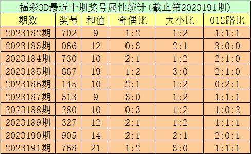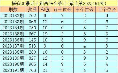 开奖回顾:第2023191期福彩3D奖号为768。奖号形态为组六,大小比为3:0,和值为21,奇偶比为1:2,012路比为1:1:1,跨度为2。