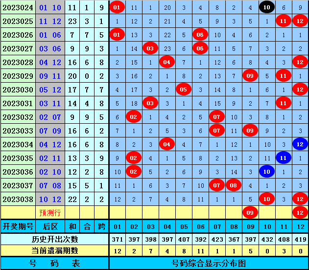 后区分析:最近30期后区奖号012路比为23:19:18,最近10期后区奖号012路比为6:6:8,上期后区为1路+0路组合10和12,本期后区参考号码02、05、09、11、12,防全0路组合再出,精选两码09、12。