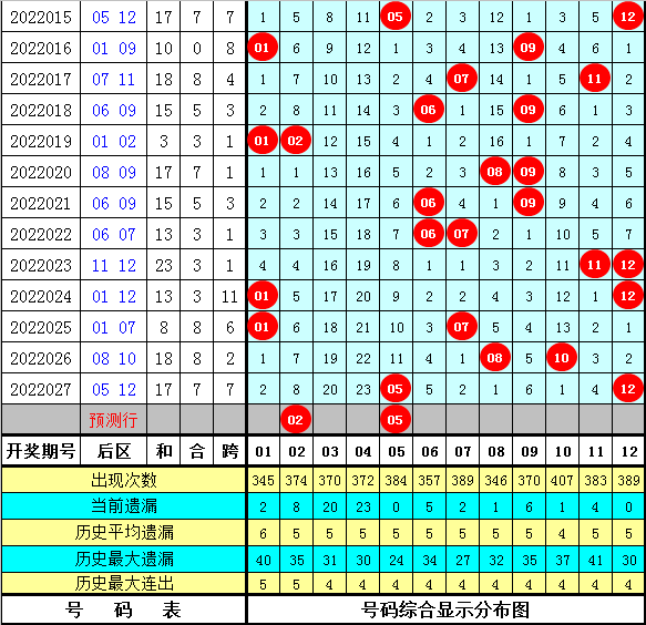 四、后区分析:在028期历史同期开奖中,后区全奇组合出现3次,全偶组合出现3次,一奇一偶组合出现9次;后区全大组合开出6次,全小组合开出3次,一大一小组合开出6次。后区本期防全小组合出现,看好两码02、05。