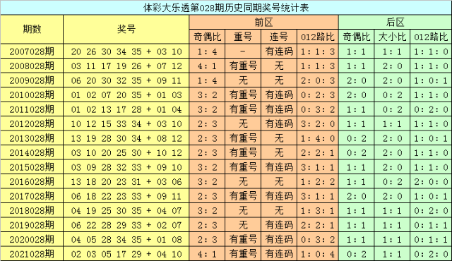 三、连号分析:在第028期历史同期奖号中连号开出9期,表现相对活跃,开出比例为60%,第2007028期、第2010028期、第2011028期、第2012028期、第2015028期、第2017028期、第2019028期、第2020028期、第2021028期出现连号,本期不看好连号组合,放弃连号。