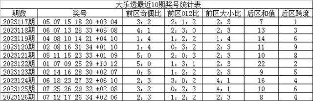 大乐透第2023126期奖号为:07 12 17 26 34+02 06。当期前区奖号012路比为1:2:2,冷热比为2:3,包含2个重号:07、26,没有开出连码,后区开出全偶、全小组合。