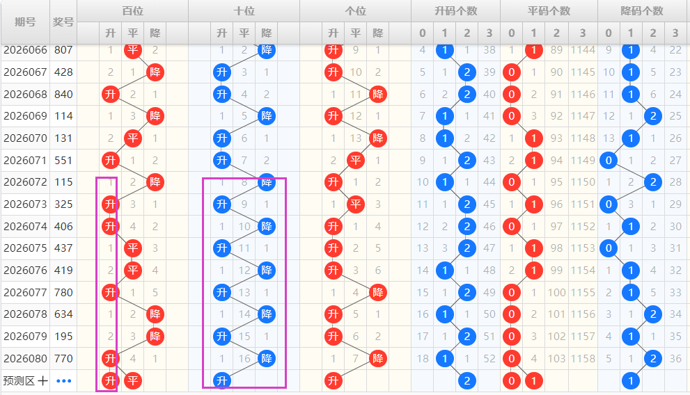 【排列3个位】:近期升降走势为:升-升-升-降-升-升-降,为一种交错走势,结合走势图可以看出,图中紫色框圈出为一种M形态的出球方式,本期可以重点看好升的形态号码的开出。