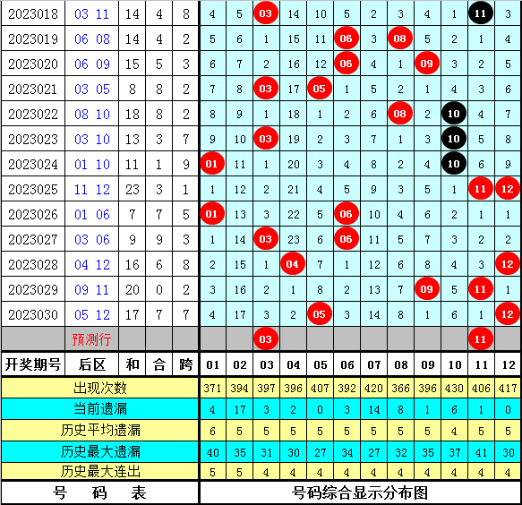 后区分析:后区上期开出奖号05 12,在最近15期开奖中奖,后区各号码频次分别为:号码11开出5次,号码03、06、10开出4次,号码12开出3次,号码01、05、08、09开出2次,号码04、07开出1次,号码02没有出现。本期预计后区在01、03、05、10、11、12之中出现,精选两码03+11。
