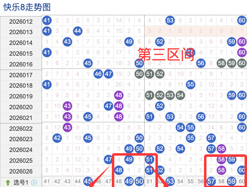 三区间开出了5个奖号(48.51.52.58.60)上期回顾三区开出5个奖号上期的三区间的奖号数量呈现一个不变的形态,4头回补1号码,本期先来看号码45近期出现频率相对来说还是很稳定。偶尔有时间隔期数也是很长,说明其在近期的开奖中较温热的,号码49在近 30 期内出现次数相对较不是稳定的号码,近期的活跃度也是较温冷。号码53有一定的间歇性,通常间隔5-3期会出现一次,没有明显的连续出现态势,走势相对较稳定,在整个第三区间的表现本期还是可以防守的。号码59走势相对近期较热,近期有连续间隔落号的情况,活跃度近期处于较热状态注意防守。