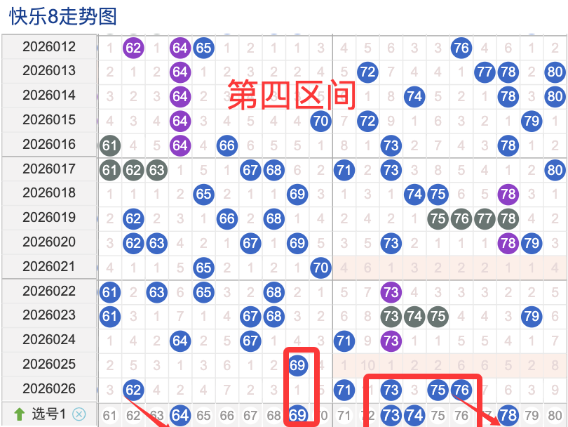 上期四区间开出了5个奖号(62.71.73.75.76)上期的四区开5个奖号呈现了一个递增的趋势,开出的奖号7头回补4个,6头回补1个,先来看号码64在近 30 期内属于还是很稳定的号码,近期出现频率相对也是稳定的,偶尔会间隔多期后出现一次,这个号码要注意防守,号码69具有一定的间歇性活跃度较稳定比如有时会间隔 3到5期就再次出现,也有时会间隔多期,近期整体出现频率比较温热,近期还是要关注的.号码73活跃度近期比较热,有一定的间歇性。活跃度近期较热,整体走势有一定的波动性.
