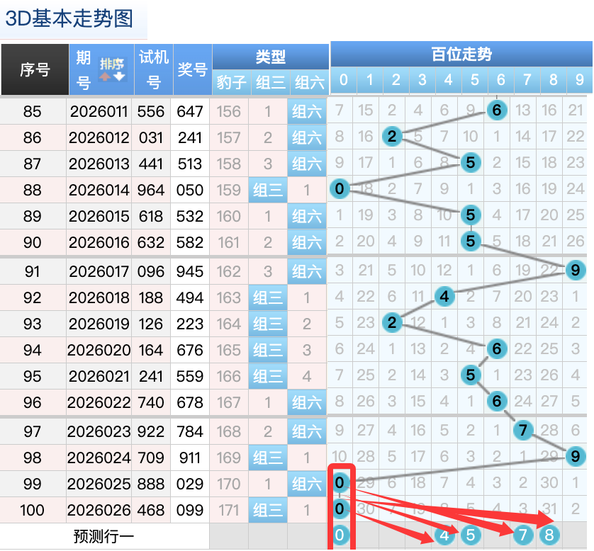3D上期百位开出的0球,这个奖号是一个重码的回补落位趋势也是一个比较好的符合百位上的落位点,先来看7号球这里还是有机会继续走出一个7跨的冷回补趋势,还有一个就是4号球和5号球这里的两个小周期号码的落位形态的概率在这里的机会还是很好的要注意防守,然后1号球这里要注意是一个顺位回补落位趋势也是冷号要注意防守,8号球在百位上要注意可能有机会走最大冷码的落位注意防守 。