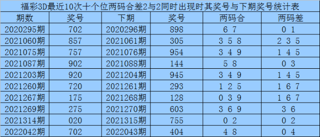 从以上统计可以看出,十个位两码合差2与2同时出现之后其下期两码合差表现最热的4个分别为:1345,本期十个位两码合差可以参考这四码中的数据。