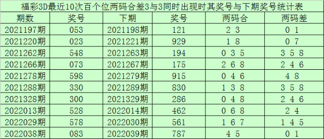 百个位合差分析:上期奖号百个位开出85组合,两码合为3,两码差为3,最近10次百个位两码合3与两码差3同时出现时,其奖号和下期奖号分别为: