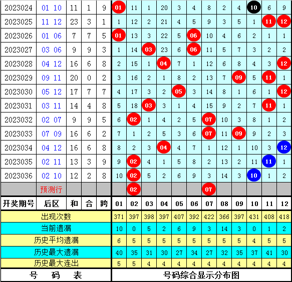 上期回顾:体彩大乐透第2023036期奖号为:01 13 22 26 31 + 02 10,其中前区号码012路比为0:4:1,奇偶比为3:2,没有开出重复号码。后区号码和值为12,跨度为8。