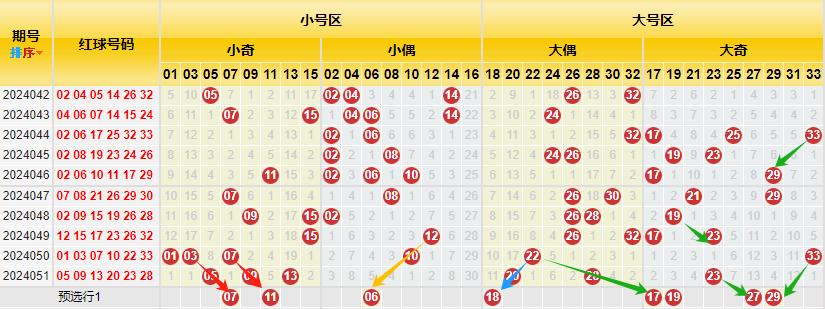 1、小大奇偶交叉图(小奇数红色箭标、小偶数黄色箭标、大偶数蓝色箭标、大奇数绿色箭标)