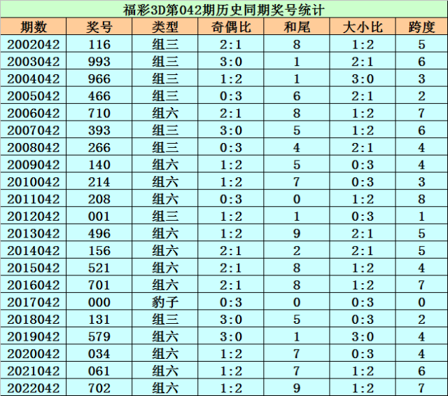 福彩3D历年第042期同期奖号为:116 993 966 466 710 393 266 140 214 208 001 496 156 521 701 000 131 579 034 061 702。