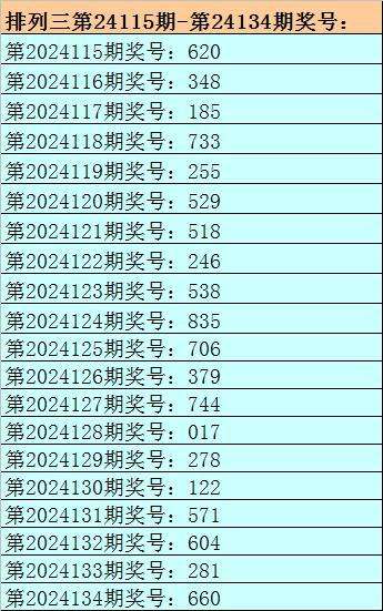 开奖回顾:排列三第2024134期开出奖号:660。其中奖号大小比为2:1,奇偶比为0:3,012路比为3:0:0,和值为12,跨度为6。