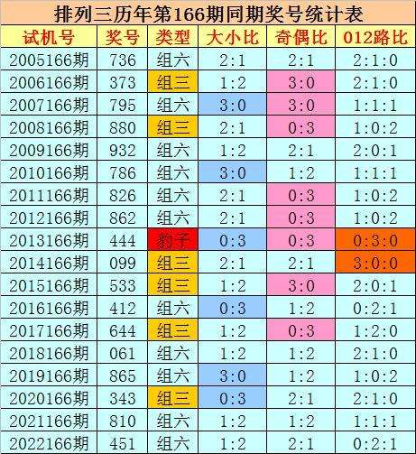 奇偶分析:历史上排列三第166期同期奖号中,奇偶比3:0出现3期,奇偶比0:3、1:2、2:1出现5期,奇偶奖号总比例开出24:30,偶数号码相对热出,今年第166期看好偶数号码继续热出,预计奇偶比开出1:2。