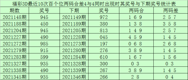 百个位合差分析:上期奖号百个位开出59组合,两码合为4,两码差为4,最近10次百个位两码合4与两码差4同时出现时,其奖号和下期奖号分别为: