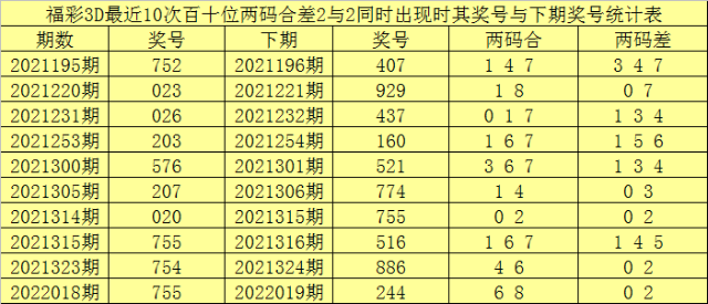 从以上统计可以看出,百十位两码合差2与2同时出现之后其下期两码合差表现最热的4个分别为:1247,本期百十位两码合差可以参考这四码中的数据。